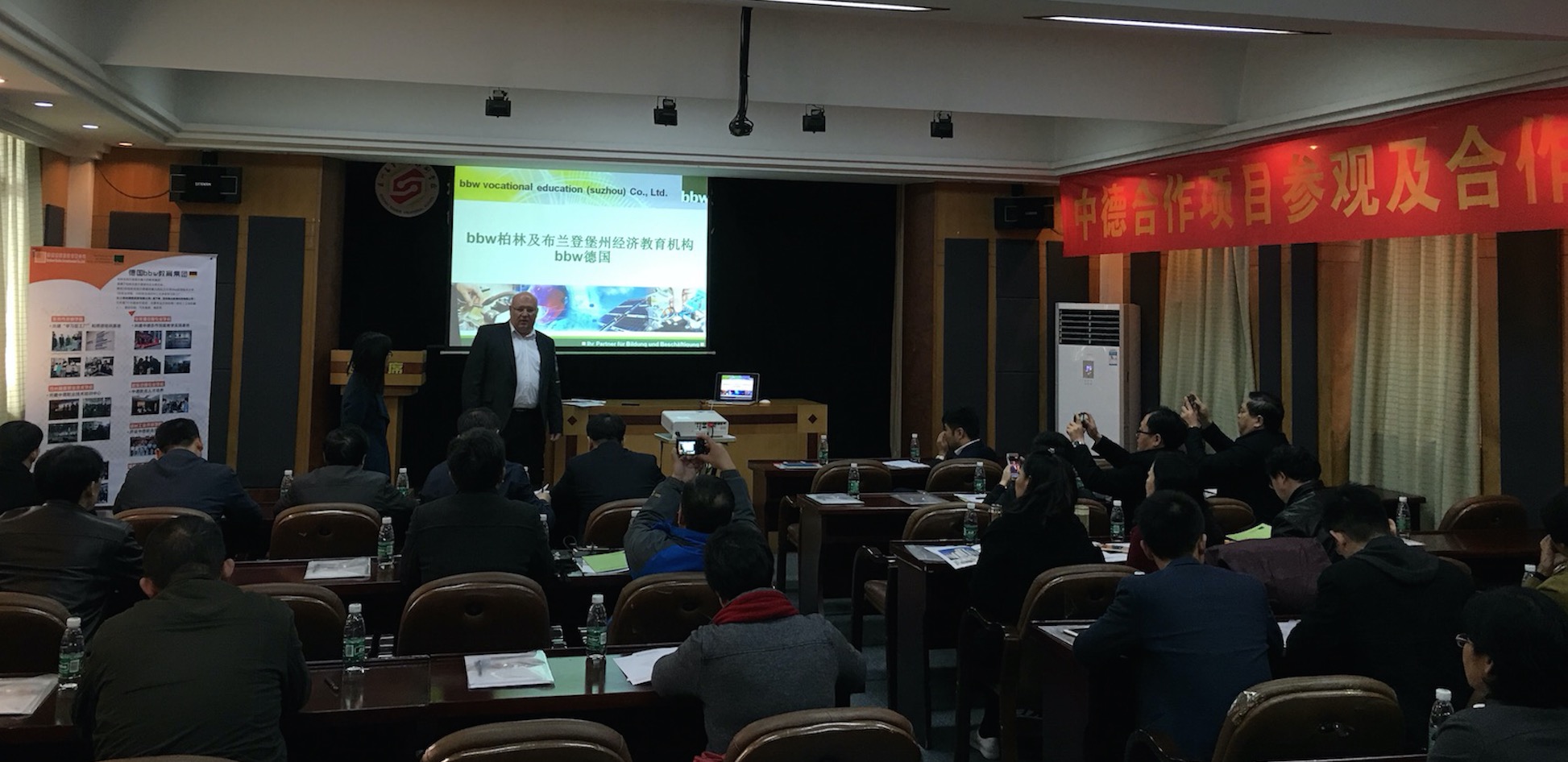 上午9:00活動(dòng)正式開始,首先由德國(guó)bbw教育集團(tuán)中國(guó)區(qū)負(fù)責(zé)人Bodo Teubert先生致歡迎辭,歡迎各位院校領(lǐng)導(dǎo)的到來,同時(shí)Bodo Teubert先生也向大家詳細(xì)介紹了德國(guó)bbw教育集團(tuán)的情況。德國(guó)bbw教育集團(tuán)是柏林及勃蘭登堡州最大的教育集團(tuán),在德國(guó)柏林及勃蘭登堡州擁有26所職業(yè)培訓(xùn)中心及多家學(xué)習(xí)型工廠,1所職業(yè)教育學(xué)院以及1所柏林及勃蘭登堡州最大的私立大學(xué),擁有近1200名員工。業(yè)務(wù)范圍涵蓋職業(yè)培訓(xùn)到學(xué)歷教育,涉及各類專業(yè)。也是德國(guó)柏林及勃蘭登堡州企業(yè)聯(lián)合會(huì)下屬的教育集團(tuán),擁有強(qiáng)大企業(yè)資源、政府資源以及高標(biāo)準(zhǔn)職業(yè)教育水準(zhǔn),為該地區(qū)超過1800家企業(yè)提供員工培訓(xùn)服務(wù)。